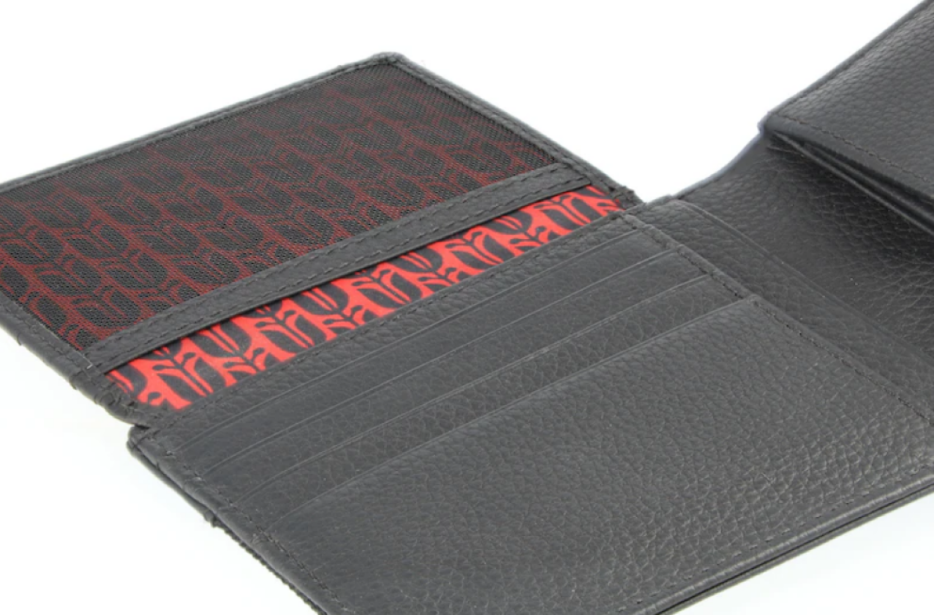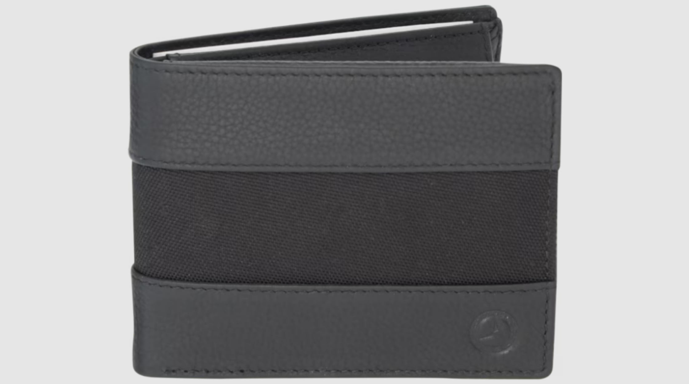 Portofelul clasic pentru bărbați, realizat din poliamidă reciclată amestecată cu piele tăbăcită vegetal, se remarcă prin designul său atemporal. Acesta include două compartimente pentru bancnote, diverse compartimente pentru inserții, șapte sloturi pentru carduri și un compartiment pentru monede cu închidere tip capse, pentru a-ți păstra banii, cardurile și documentele importante în siguranță. În plus, portofelul impresionează și prin aspectul său estetic. Designul negru este completat de o căptușeală interioară cu imprimeu negru-roșu cu frunze de laur și un stea vintage gravat în piele.