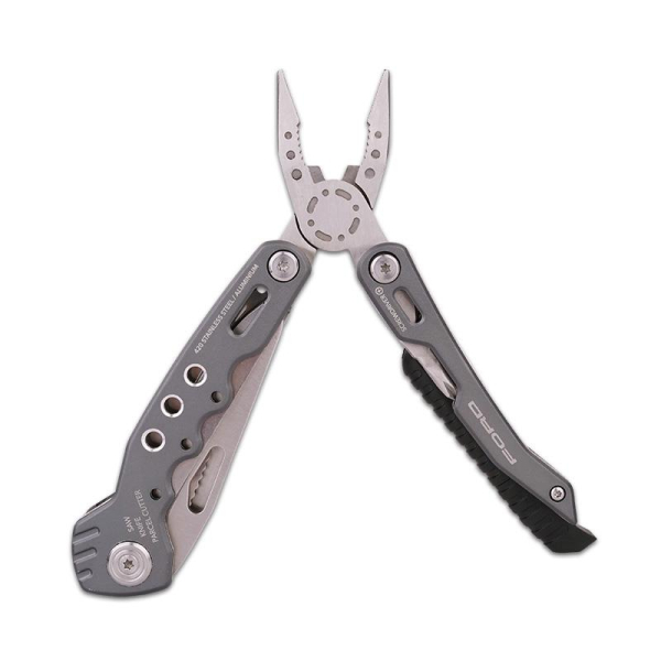 Instrumentul multifuncțional Ford pentru exterior, cu o gamă largă de funcții, are tot ce aveți nevoie pentru o aventură: clește cu vârf, clește, tăietor lateral, cuțit, ferăstrău, foarfece, cuțit pentru pachete, șurubelniță cu crestat în 2 dimensiuni, deschizător de sticle, șurubelniță Phillips, pilă , oțel de foc și un fluier.