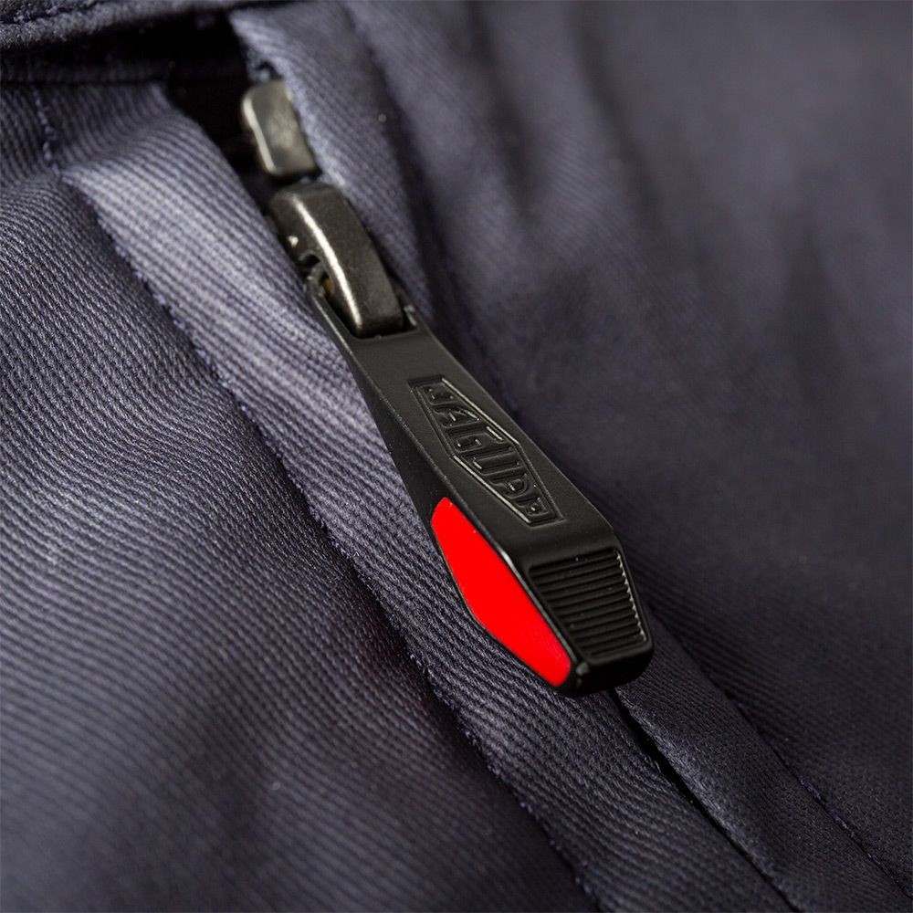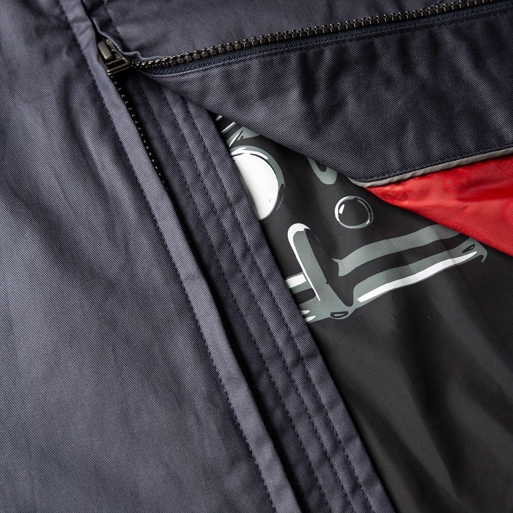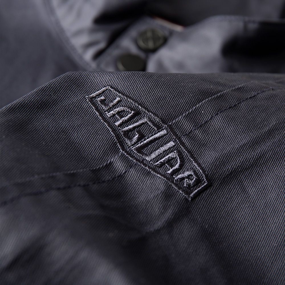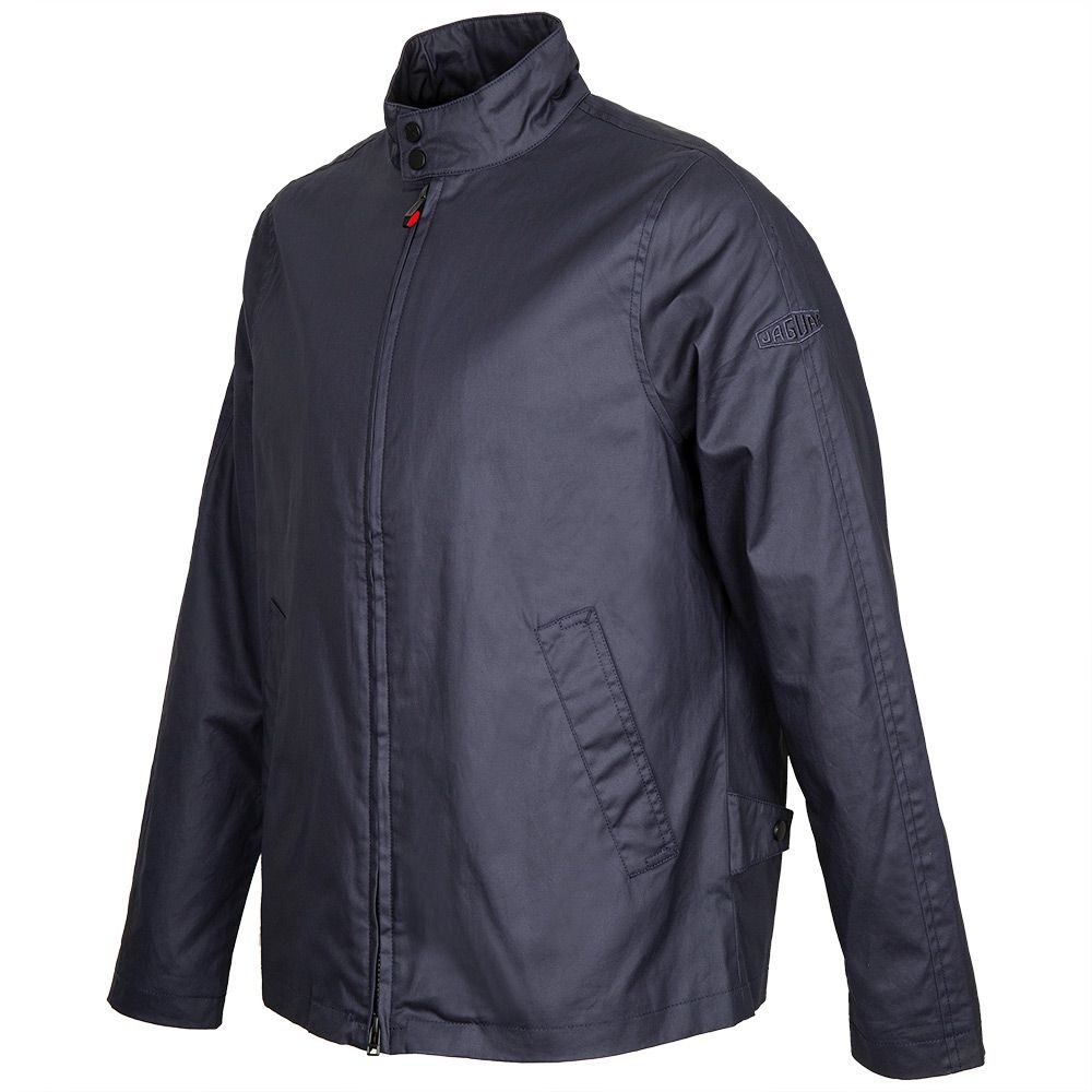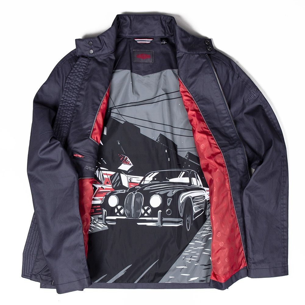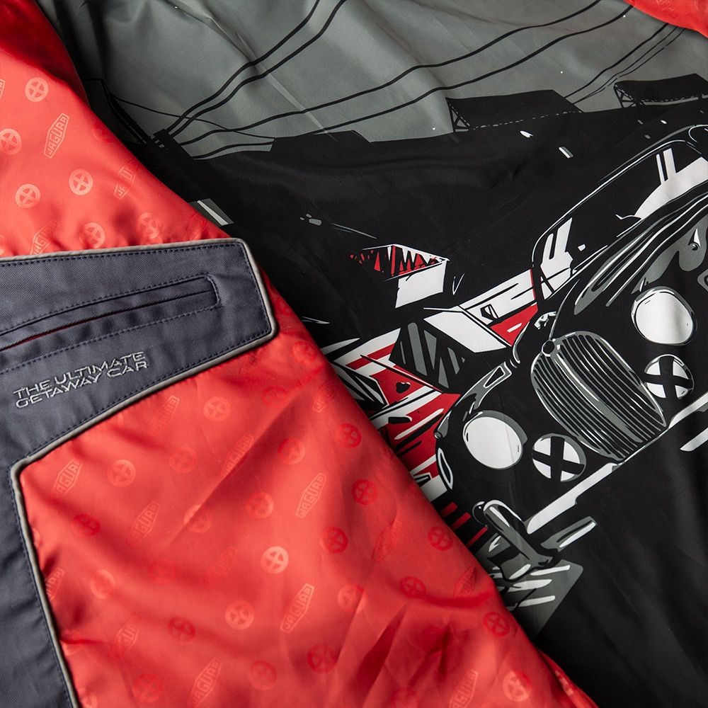 Fabricat din bumbac pur cu un finisaj ușor de ceară. Prezintă grafic dinamic Jaguar Mark II pe căptușeala interioară și semnul verbal Ultimate Getaway Car pe buzunarul interior. Complet cu dispozitive de reglare a spatelui și tragere cu fermoar Heritage losange.