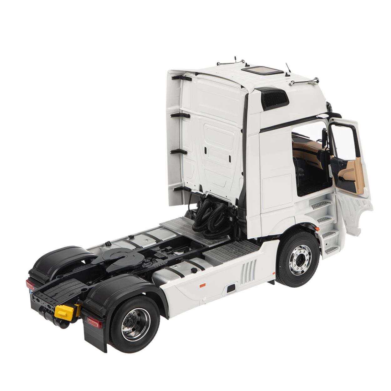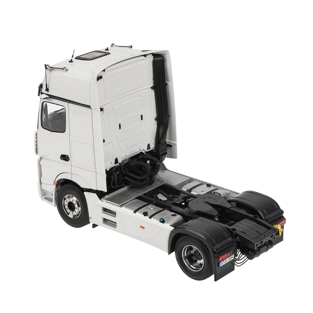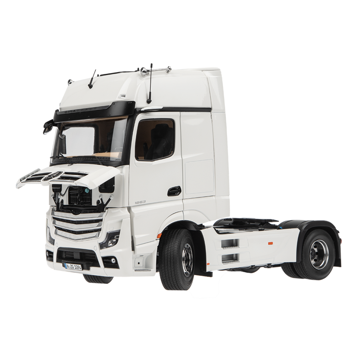 Model la scară de înaltă calitate al NZG Mercedes-Benz Actros L, în culoarea albă.
