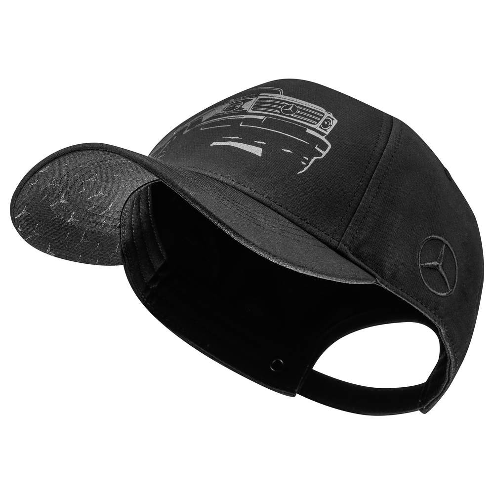 Pentru timp liber, sport sau pista de curse: șapca neagră de baseball oferă protecție fiabilă împotriva soarelui sau a ploii. Șapca cu 5 panele impresionează prin detalii, precum steaua Mercedes brodată ton pe ton pe partea stângă, motivul vehiculului Clasa G imprimat în gri închis pe partea din față, bucata de material Clasa G cu seria de modele, unghiul de cădere și cel de rampă pe partea dreaptă. Chiar și în materie de confort, șapca nu lasă nimic de dorit - o clemă practică reglabilă pentru ajustarea șepcii asigură un confort plăcut la purtare.