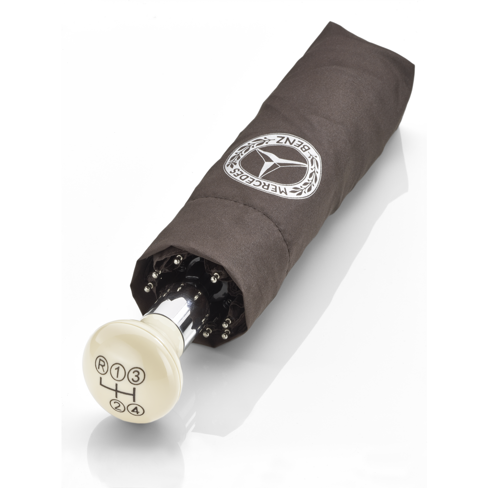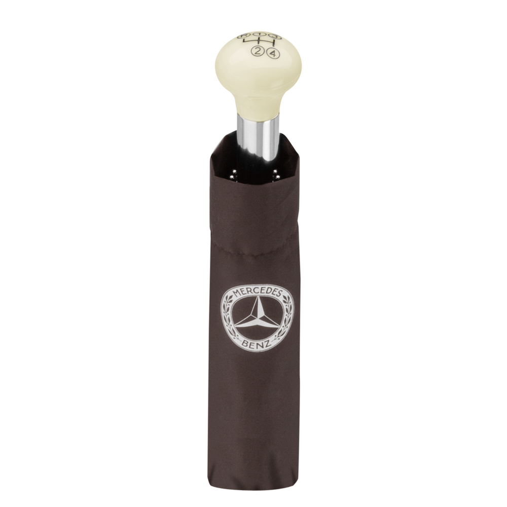 Cântând în ploaie! Faceți față ploilor grele cu mini-umbrela maro. Mânerul său elegant are un buton asemănător schimbătorului de viteze al modelului 300 SL, iar dimensiunile compacte ale umbrelei manuale înseamnă că este ușor de purtat în geantă. Când este deschisă, umbrela are un diametru de aprox. 97 cm și umbrarul din poliester, cu acoperire specială, rezistentă la apă și murdărie, oferă protecție fiabilă în ploaie. Nici vântul nu pune probleme umbrelei compacte, datorită sistemului anti-vânt și cadrului din fibră de sticlă și metal de calitate superioară. Un canal de siguranță, un capac în culori coordonate, o clapetă cu buton cromat și vârfuri de nichel cromat completează caracteristicile umbrelei. O etichetă țesută Bornemann și un imprimeu argintiu pe un segment și pe copertă oferă accente vizuale atractive.