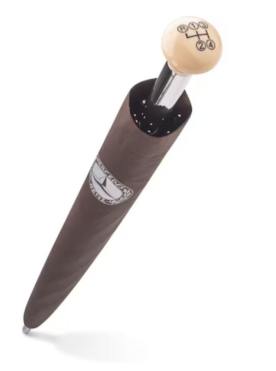 Umbrela pentru oaspeți 300 SL cu schimbător automat de viteze nu te va dezamăgi atunci când începe să plouă. Acest accesoriu personal, cu o husă exterioară maro, fabricată din poliester pongee 100% (reciclat) și un imprimeu argintiu cu logo-ul istoric Mercedes-Benz, este mai mult decât o simplă umbrelă. De exemplu, există mânerul exclusiv în formă de schimbător de viteze. În al doilea rând, componente precum nervurile din fibră de sticlă și un tijă din oțel cromat de 14 mm cu o glisieră neîntreruptă confirmă calitatea designului rezistent la vânt - Culoare: maro
