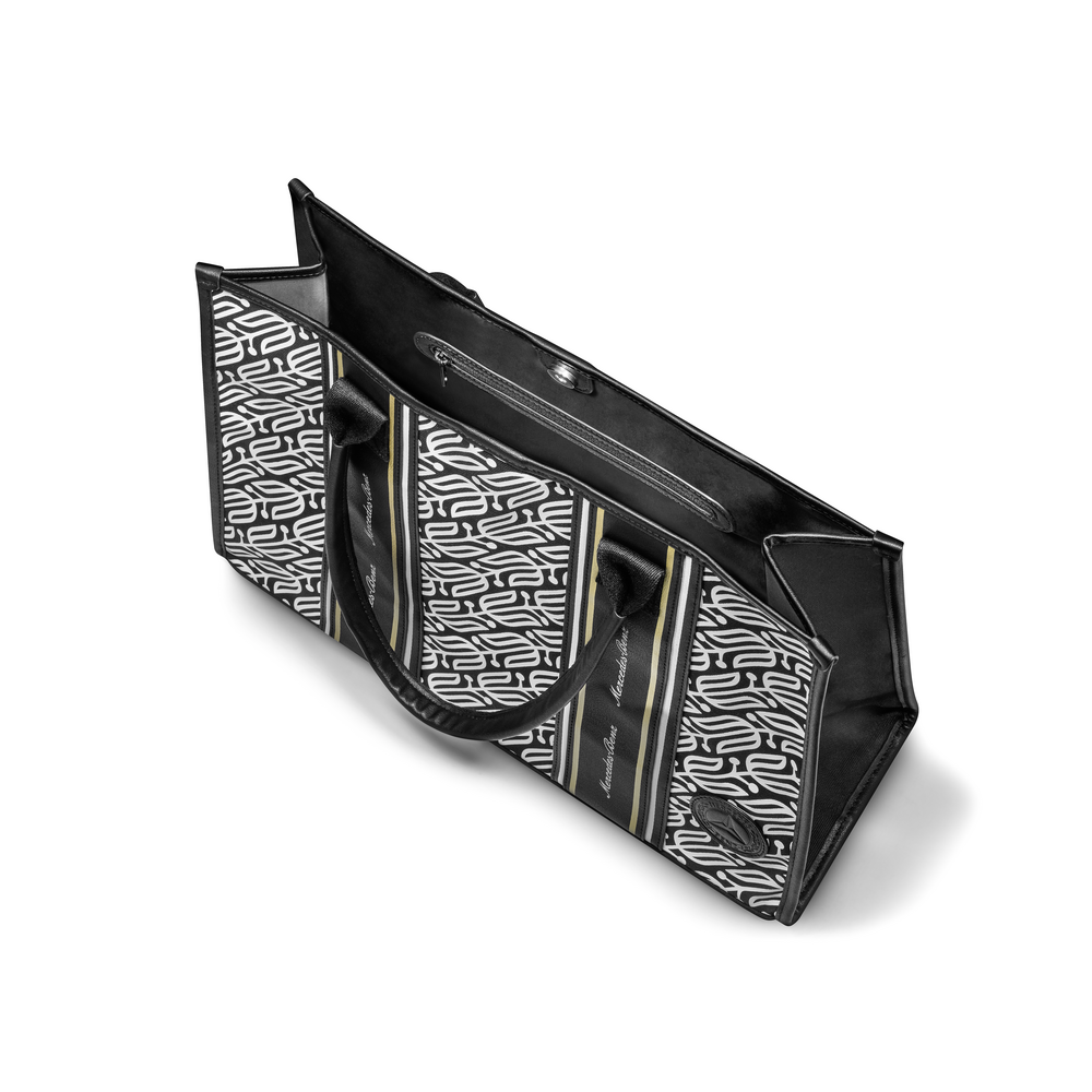 Indiferent dacă este vorba de diverse mici activități după serviciu sau de o sesiune de cumpărături - geanta shopper Mercedes-Benz Classic oferă mult spațiu pentru tot felul de lucruri și este ușor de închis cu o capsă magnetică interioară de culoare argintie. Pe lângă un compartiment principal mare cu parte inferioară întărită, există și un mic buzunar interior cu fermoar. Chiar și din punct de vedere vizual, geanta shopper are multe de oferit, lăudându-se cu un model imprimat de laur și dungi pe față și spate. Părțile laterale și partea inferioară sunt negre. Cele două mânere din exterior, întărite cu piele PU în zona de prindere, asigură un nivel ridicat de confort la purtare. Insigna din piele este gravată cu: Versiunea veche de stea.