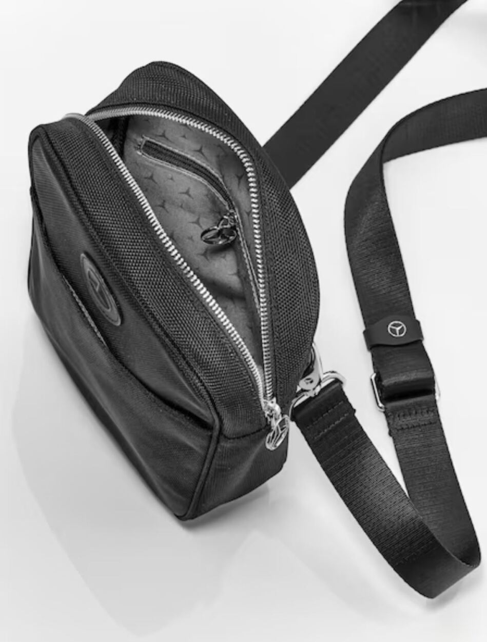 Geanta de umăr fabricată din poliamidă reciclată este un companion versatil care vă permite să purtați cu dumneavoastră cele mai importante lucruri în orice moment. Geanta este echipată cu un compartiment principal mare, cu un buzunar separat cu fermoar. Există, de asemenea, un buzunar mic pentru o etichetă de urmărire de până la o dimensiune maximă de 40 mm x 40 mm. O curea de transport detașabilă, a cărei lungime poate fi ajustată individual, asigură o potrivire confortabilă. Fermoarele argintii și fermoarul 3D în formă de stea contrastează elegant cu materialul negru din nailon. Un detaliu special este brandingul atrăgător, care conferă genții de umăr o notă exclusivă. Atât insigna cu logo, cât și alte aplicații din piele de pe geanta de umăr sunt fabricate din aceeași piele utilizată pentru scaunele și dotările din interiorul rafinat al vehiculului Mercedes-Benz Clasa S.